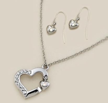 SNT88: Crystal & Silver Heart Necklace and Heart Earrings Set