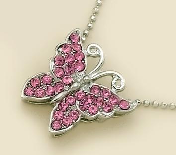 NA146P: Pink Crystal Silver Butterfly Necklace on Caviar Chain