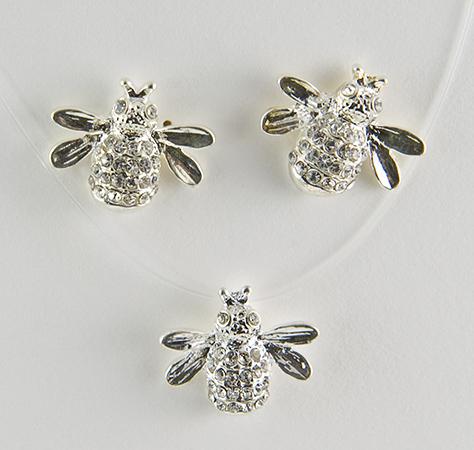 Pierced Bee Earrings & illusion bee Necklace Set accented with Austrian crystals. Necklace is approx. 17" long. Available in Gold or Silver (please specify color when ordering).