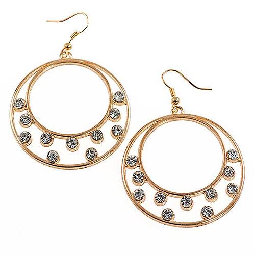 These stylish open hoops are accented with crystal and dangle ever so gracefully on a French wire. Circumference is approximately one and a half inches. Earrings are available in a Coppery Gold, Shinny Silver or Antique Rhodium Silver Finish. Please specify color when ordering . Lead compliant.