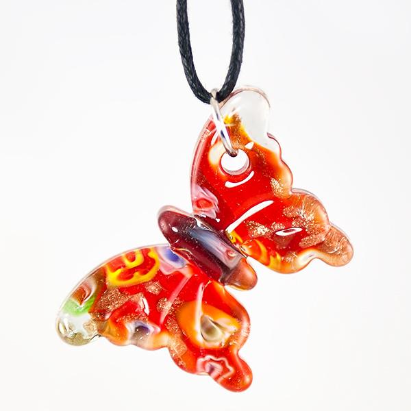This pretty Moreno Style Butterfly Necklace comes is 4 assorted colors Red, Blue, Topaz, and Black. Each Butterfly is unique and will vary in color. Sorry color selection is not available. Leather style chain is 18 inches long and pendent can accommodate a collar.