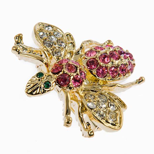 Bee Pin accented with pink and clear Austrian crystals in a gold finish setting. Available in Amethyst . Measures approximately 1.25 inches long. Please specify color when ordering. Also available in other colors (PA250).