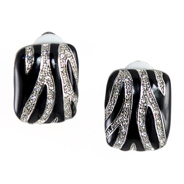 Elegant Crystal Zebra Necklace in Black and Clear Austrian Crystal set in a silver Pendant that can be worn in reverse. Earrings are clip, and are approximately .75 of a inch long.