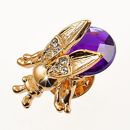 Gold Bee pin with crystal body and movable wings. Available in Clear (pictured in photo), Pink, Red, Green, Blue, Purple and Pearl. (Please specify color when ordering.) Please note some shipments come with a Tack or Pin back. If you have any questions please call our office.