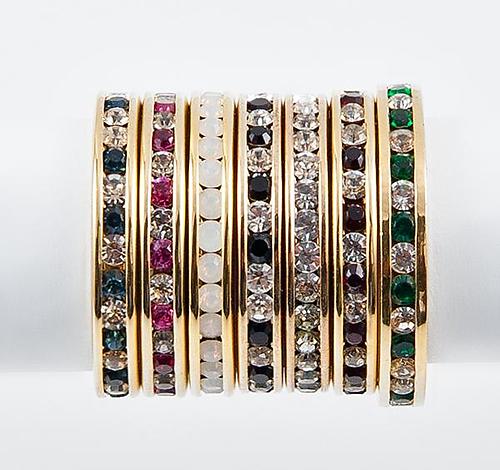 Beautiful Eternity Band CZ Rings set in satin gold setting. Each ring has clear diamond CZs alternating with your choice of Blue, Green, Red, Black, Opal or Pink CZ's. These lovely eternity bands can also be worn on a chain as a necklace. Available in whole sizes: 5, 6, 7, 8, and 9. Size 6 and 7 are sold out in pink.Please specify CZ color and size when ordering.