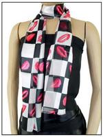 Silky checkered black and white scarf with red Lip graphics. Comes in Small (20" by 20") and Long (14" by 5 ft.). We have a few left in LONG please call our office to place a order on the small size.